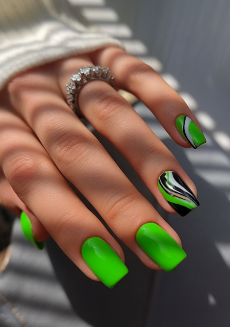 A striking 2025 green manicure featuring glossy neon nails paired with bold black and white abstract swirls. The short, square shape keeps it modern, while the dnd-style line work adds a dynamic touch. The gel polish creates a sleek, polished effect, making it a popular choice for March nails color ideas 2025. This look is perfect for those who love bold, high-contrast ideas 2025.