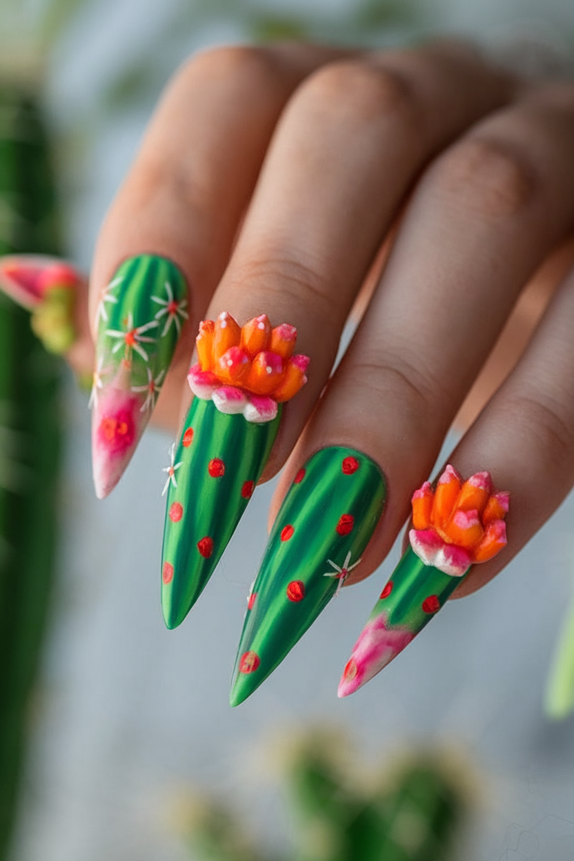 #24 Cactus-Inspired Nail Art with 3D Elements