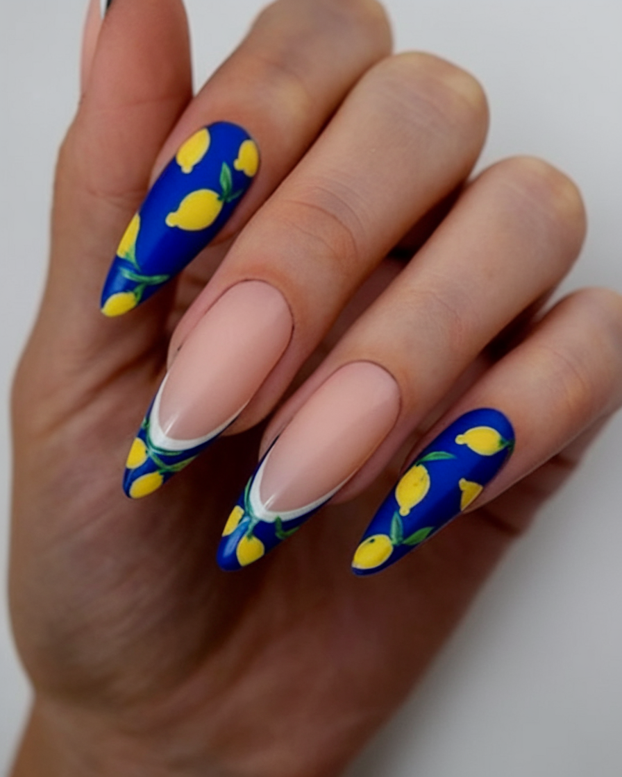 A creative twist on the French manicure, this 2025 OPI look features deep blue tips adorned with delicate hand-painted lemons. The contrast between the soft nude base and the bright citrus design makes this 2025 gel manicure unique. The dnd-style details add charm and elegance, making it a popular choice for those who love fresh, nature-inspired inspo. This design is perfect for both short and almond nails.