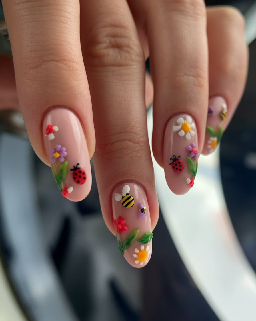 This cute floral-inspired manicure showcases tiny hand-painted flowers, ladybugs, and bees over a soft nude base. The dip powder technique ensures a smooth and long-lasting effect, while the 2025 dip elements add depth and texture. The intricate details make this design a standout choice in march nails color ideas 2025. Whether you’re looking for a playful early spring style or gel nail ideas 2025, this look is a charming option.