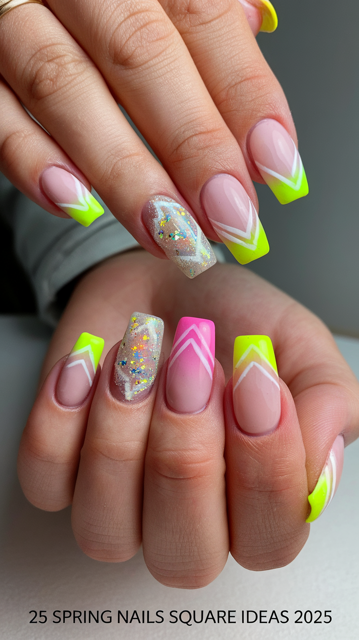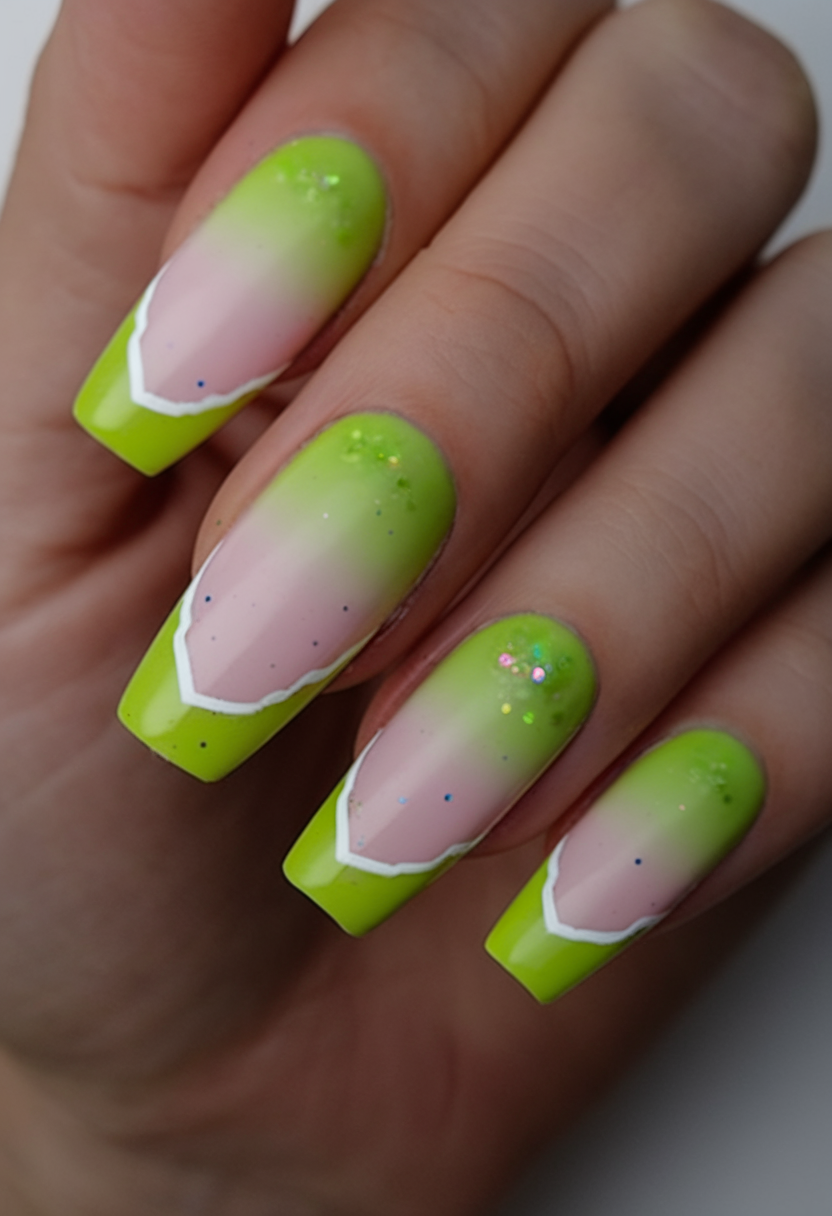 This fresh take on a classic French manicure brings a lively lime green gradient effect that seamlessly blends into a natural nude base. A white angular outline defines the French tip, making the design crisp and modern. Small flecks of glitter are scattered across the nails, adding a touch of playful sparkle.