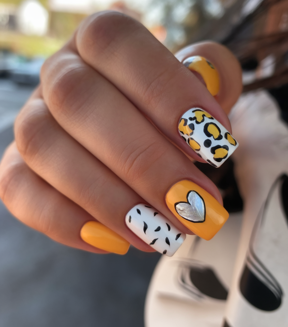 This trendy square-shaped design combines vibrant yellow with animal prints, making it a perfect pick for spring. The mix of cheetah spots, black and white accents, and a silver heart embellishment creates a fun yet classy look. The alternating solid colors and patterned nails add dimension while keeping the set elegant and eye-catching.