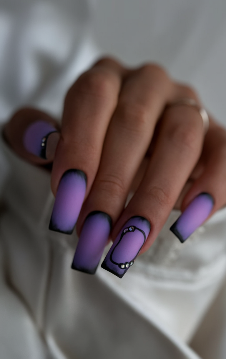 This long square-shaped set features a smooth ombre blend from soft lavender to deep violet, creating a dramatic spring nails square ideas 2025 look. The black edges add a bold outline, giving the nails a trendy and artistic finish. A subtle 3D accent with tiny rhinestones enhances the simple yet elegant matte design.