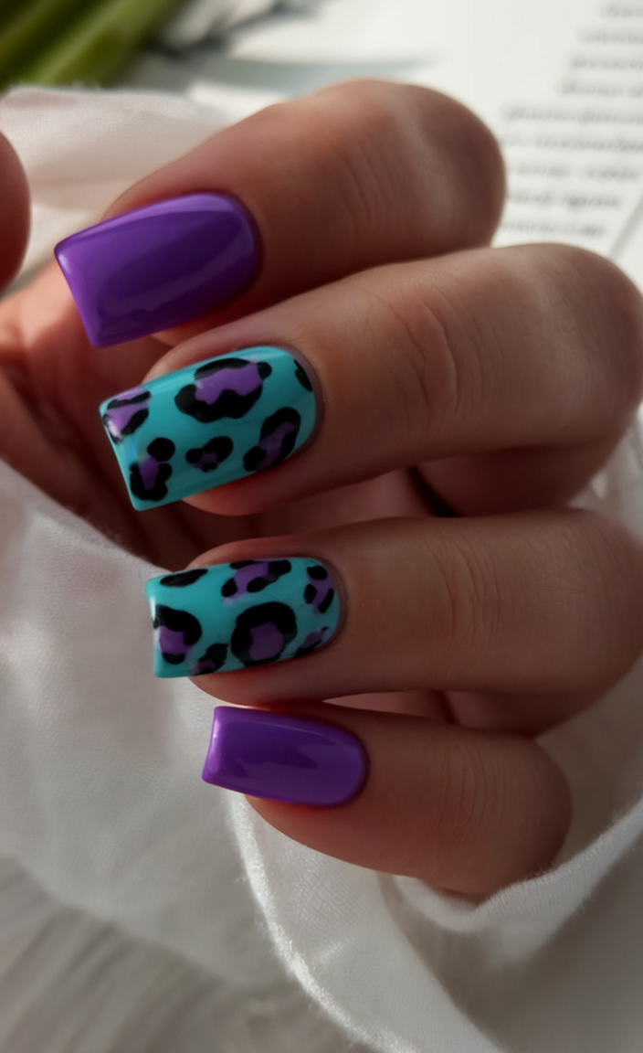 A bold mix of solid and patterned nails, this short to medium-length set combines glossy purple with teal leopard print for a fun and trendy effect. The black leopard spots give an edgy contrast, making this a standout choice for spring 2025 inspo. The high-shine finish ensures this set remains sleek and eye-catching.