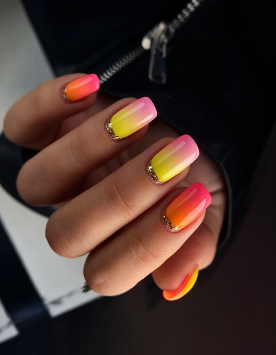 Bright yellow and pink ombre creates a vivid gradient effect, making this short square set a perfect early spring design. The golden glitter accents near the cuticles add a touch of elegance, elevating the look from simple to chic. This trendy spring set captures the warm hues of a sunset, making it an eye-catching 2025 choice.
