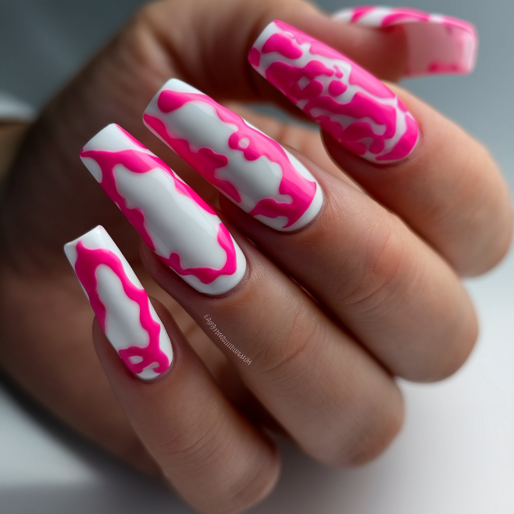 This long square-shaped set features a glossy white base with abstract neon pink drip accents for a bold and modern look. The fluid-like pattern creates a unique artistic effect, making this a trendy choice for spring 2025. The high-shine finish enhances the contrast, giving this acrylic design a striking edge.