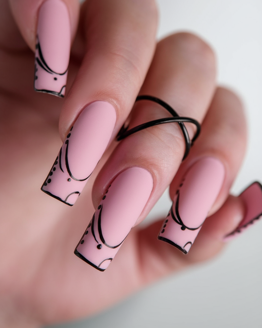 This soft matte pink square set is elevated with delicate black line art, creating a sophisticated and modern design. The thin curved lines and dot accents bring a subtle elegance, making this a simple yet classy choice. The medium-length acrylic shape ensures this spring design remains both chic and wearable.