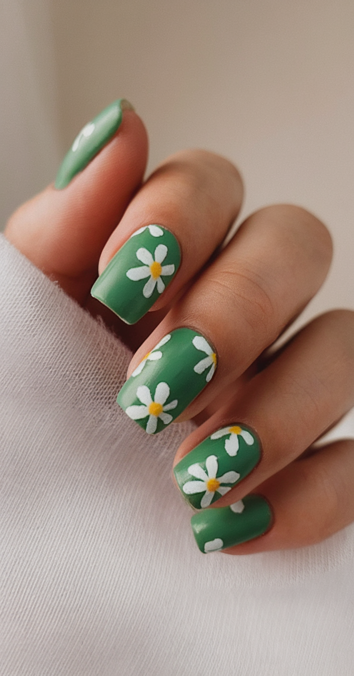 This short square-shaped set features a soft green matte base decorated with hand-painted white daisies. The simple floral accents with yellow centers create a fresh and charming spring look. This trendy short green design is perfect for Easter, March, and early spring 2025, adding a touch of nature-inspired beauty.