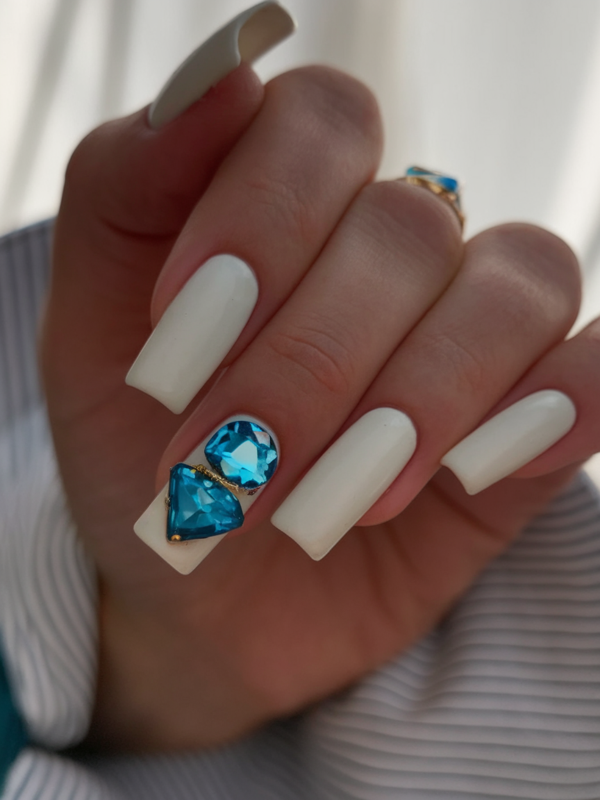 A classic white square-shaped set is elevated with bold blue gemstone accents for a luxurious and elegant effect. The large-cut crystals add a dramatic touch, making this set perfect for those who love statement spring nails. The glossy finish and precise acrylic shape ensure a chic and polished appearance.