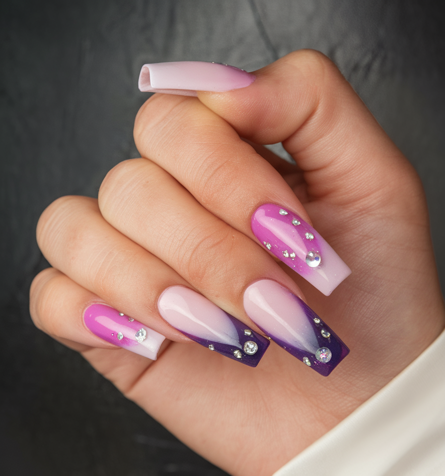 This elegant medium-length acrylic set blends pastel pink and deep purple into a seamless ombre effect. The French tip-inspired fade is accentuated with delicate rhinestones, adding a classy and sophisticated touch. A perfect look for Easter, March events, or early spring outings, this style is both simple and stylish.