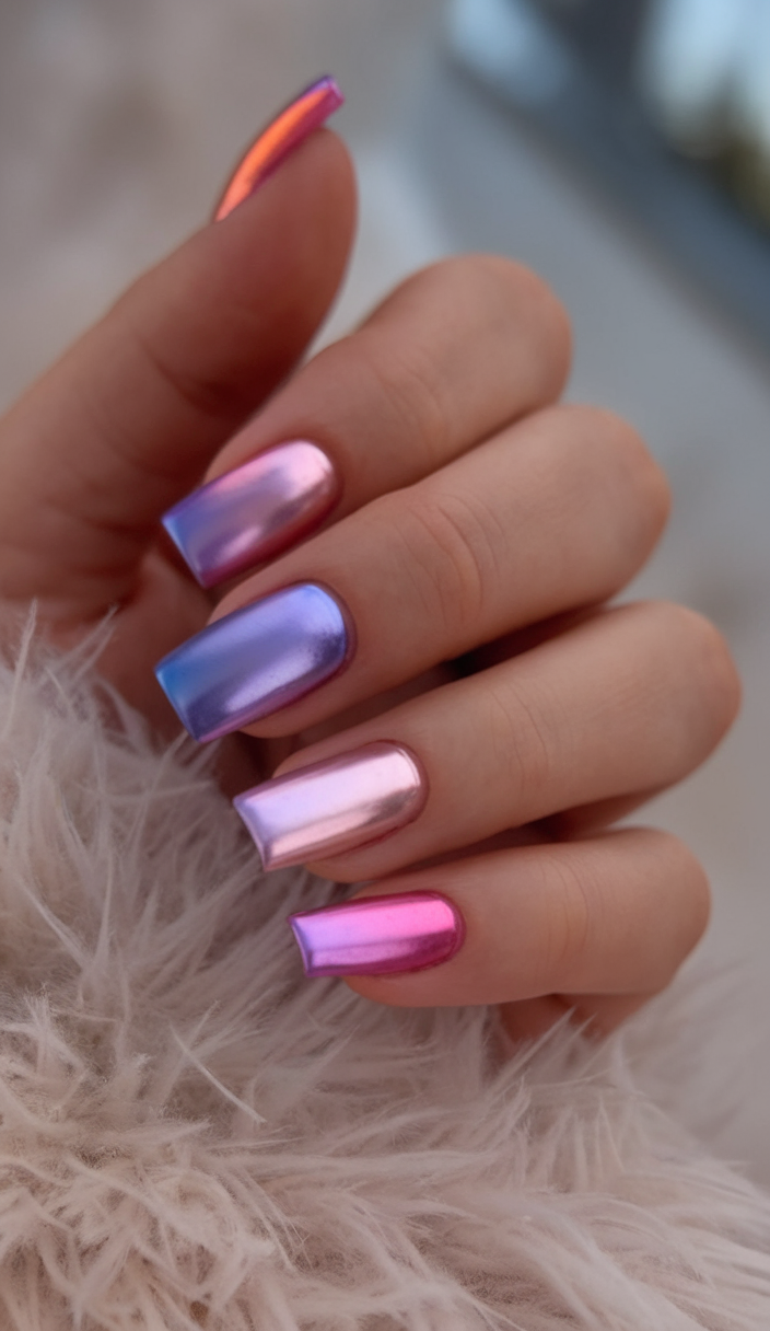 A long square acrylic set with a mesmerizing chrome finish in pink, purple, and blue tones creates a futuristic and stylish effect. The high-shine reflection shifts with the light, giving the nails a trendy and elegant appeal. This simple yet eye-catching design is a perfect spring inspo choice for a modern, sleek look.