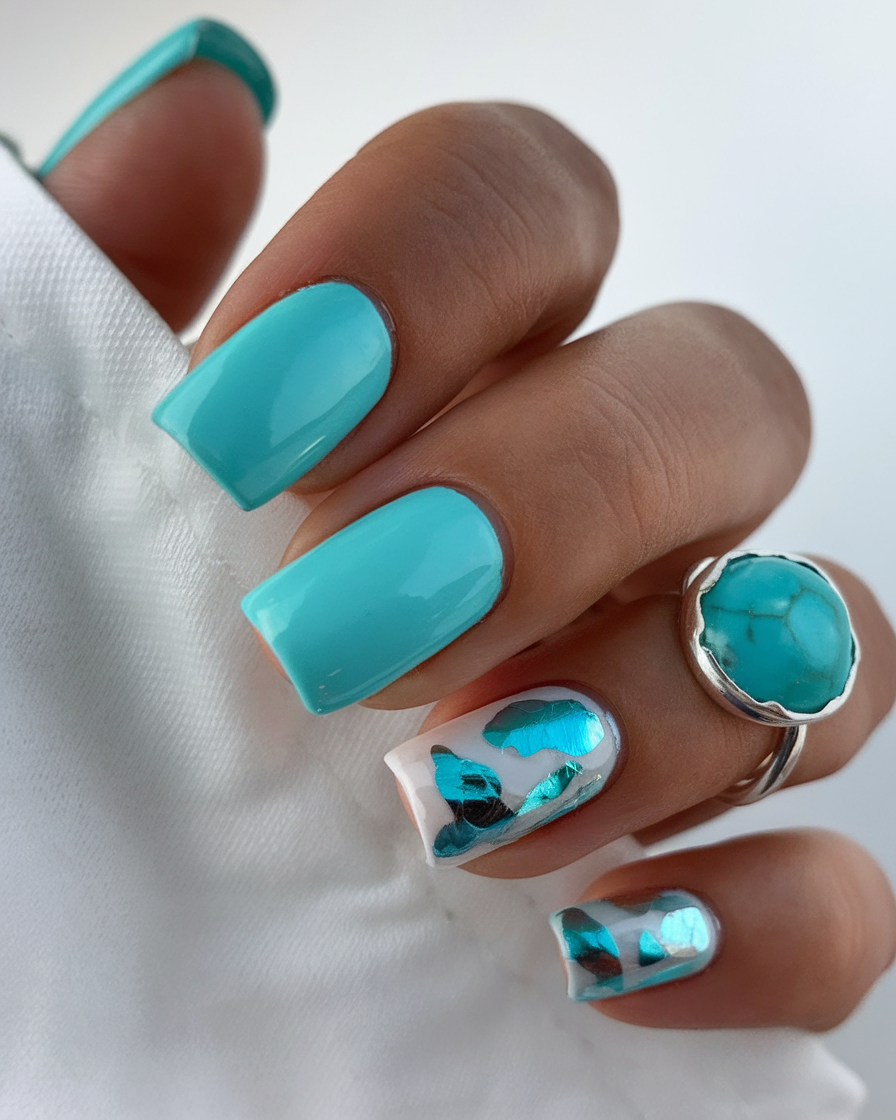 This short to medium square set combines solid aqua blue nails with white accent nails featuring metallic foil butterflies. The shimmering foil details add an artistic and delicate touch, making this set a fresh and trendy choice for spring 2025. The glossy finish and intricate detailing enhance the overall elegant and playful look.