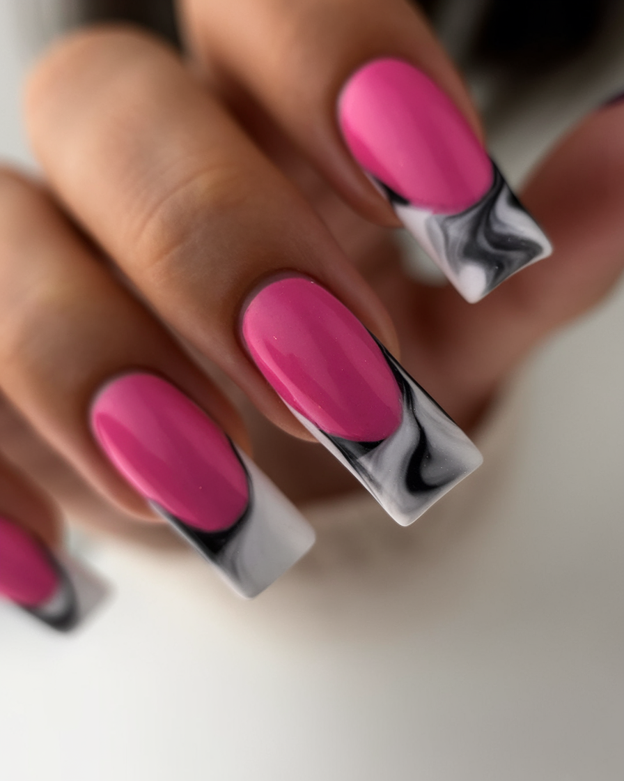 A striking combination of hot pink and monochrome marble, this nail design offers a bold contrast between vibrancy and elegance. The solid pink nails set the tone for a lively, confident look, while the black and white marble tips add a luxurious and artistic flair.