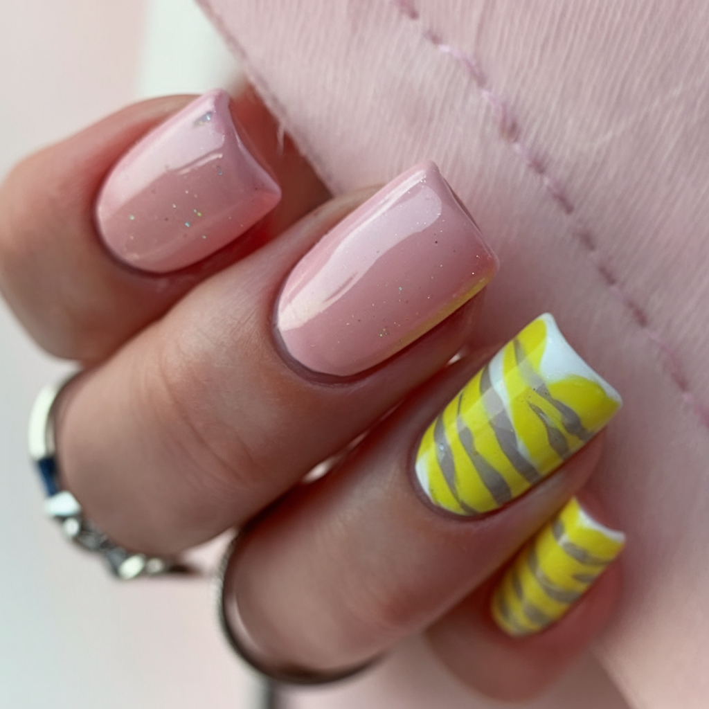 A mix of soft nude pink and bold yellow zebra print creates a trendy yet sophisticated nail look. The sheer pink base exudes a delicate elegance, while the animal print accent nails add a fierce edge to the otherwise minimalistic design.