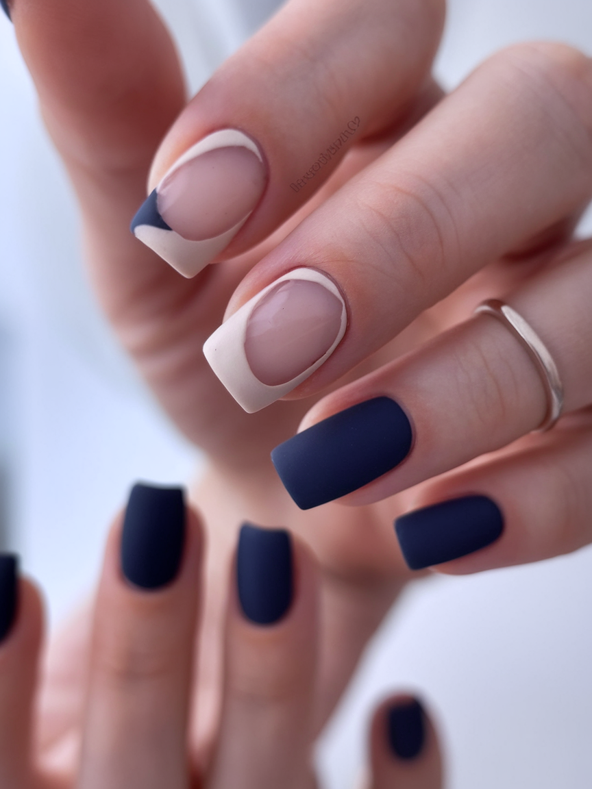 This sophisticated deep blue manicure features a mix of solid matte navy nails and abstract French tips in a minimalist nude and blue combo. The negative space French design with curved edges offers a modern twist on a traditional classic.