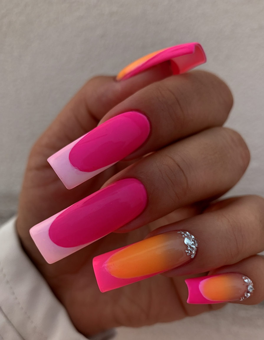 If you’re looking for bold inspo, this long, square acrylic set brings the heat. A vivid pink base transitions into bright orange tips, making it a trendy choice for spring 2025. The crystal embellishments near the cuticles give it a glam touch, while the ombre design ensures a smooth, eye-catching finish.