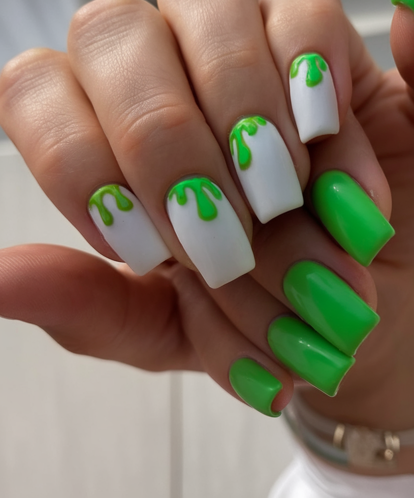 This trendy square-shaped design brings a bold contrast between crisp white and neon green. The dripping effect near the cuticle creates an artistic and eye-catching look, making it perfect for those who love bold spring designs. The glossy finish enhances the acrylic shape, making the colors pop for a fun and fresh manicure.