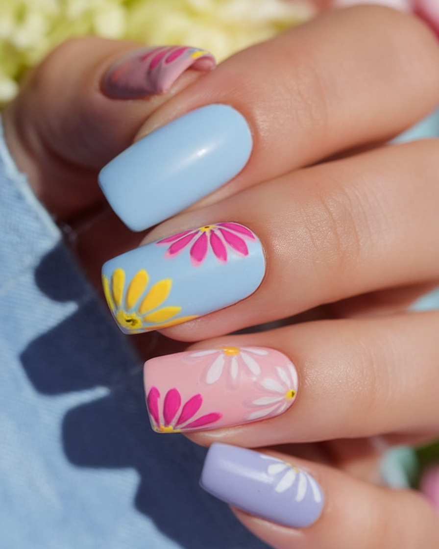 Soft pastel blue, pink, and lavender create a spring-inspired base for this floral design. Delicate daisy accents in yellow, white, and magenta add a cheerful and Easter-ready feel to this short to medium-length set. The simple yet elegant look makes it a great choice for a classy spring manicure that stays fresh throughout March.