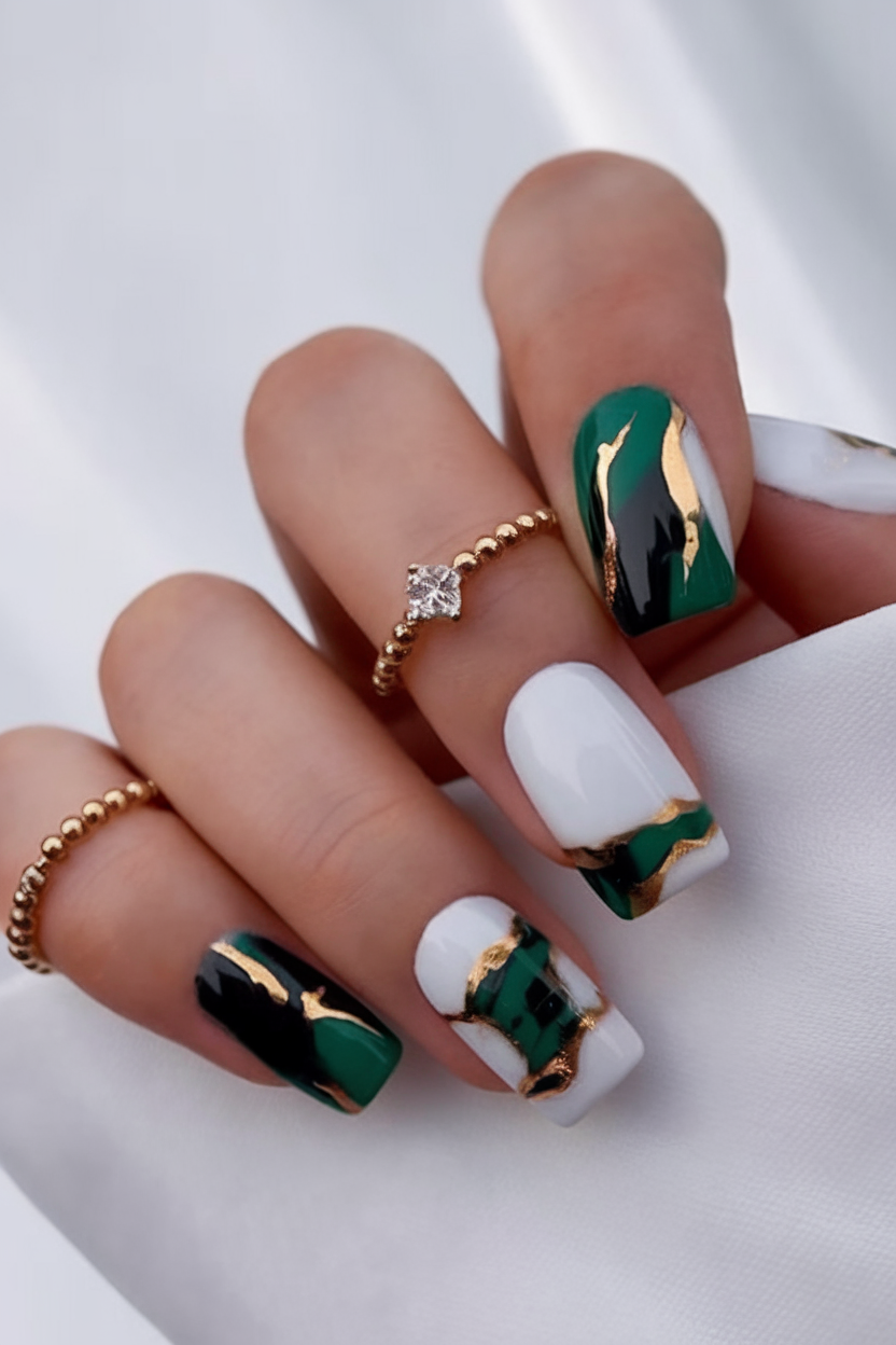 A sophisticated mix of deep green, white, and gold accents gives this square nail set a luxurious touch. The marbled effect adds texture and depth, while the metallic gold veins elevate the classy and elegant aesthetic. This trendy spring design works beautifully for a chic and polished look that pairs well with any early 2025 outfits.