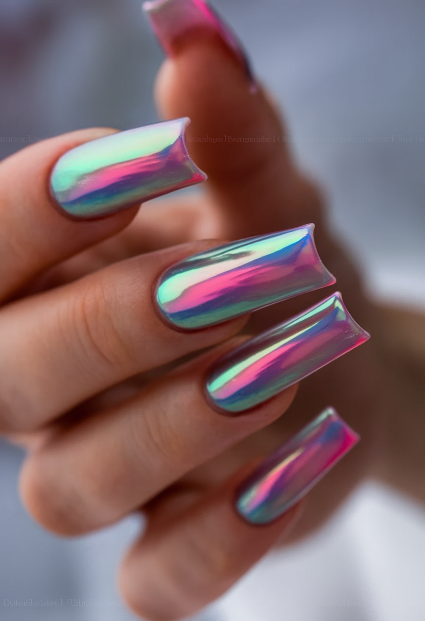 This long, square acrylic set features a mesmerizing chrome finish with shifting tones of pink, blue, and green. The reflective holographic effect adds a futuristic and trendy touch, making it a standout spring design for 2025. The sharp-edged shape enhances the high-shine finish, creating an effortlessly elegant and modern look.