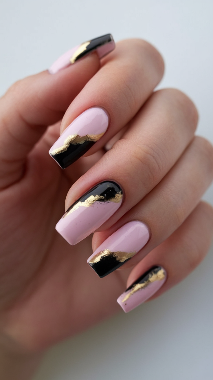 A delicate blend of soft blush pink with black accents and gold foil detailing creates a classy yet bold manicure. The organic black tips paired with gold leaf strokes give this medium-length square set a sophisticated edge. This simple yet elegant design is ideal for an early spring refresh, offering both trendy inspo and luxurious charm.