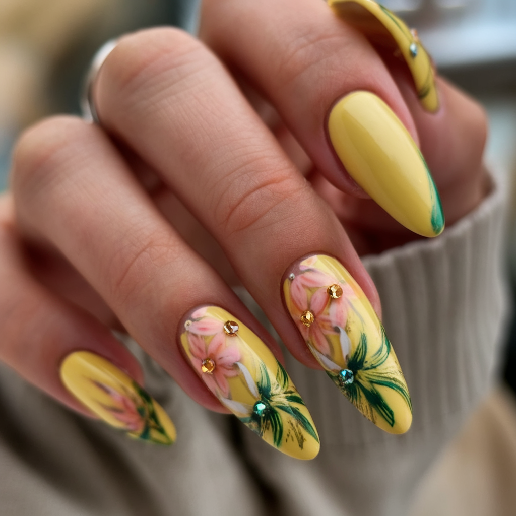 This bright yellow manicure features a delicate hand-painted floral design, blending soft pink and green details for a fresh, nature-inspired look. The almond shape adds elegance, while tiny rhinestones highlight the intricate artwork, making this a perfect style for prom or a birthday celebration. The glossy finish enhances the depth of color, creating a polished and stylish effect. For those who love simple spring nails with an artistic touch, this is a must-try for 2025.