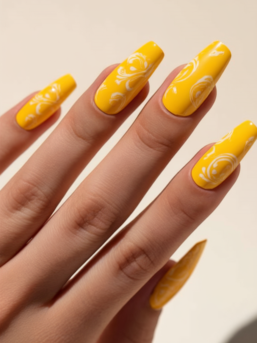 This bright yellow design features delicate white swirl patterns that add a touch of elegance and sophistication. The square shape enhances the clean and polished look, making it perfect for both casual wear and formal events. The glossy spring gel finish gives the nails a luxurious shine while keeping the 2025 aesthetic sleek and refined. This look is a perfect match for a stylish dress or a prom ensemble.