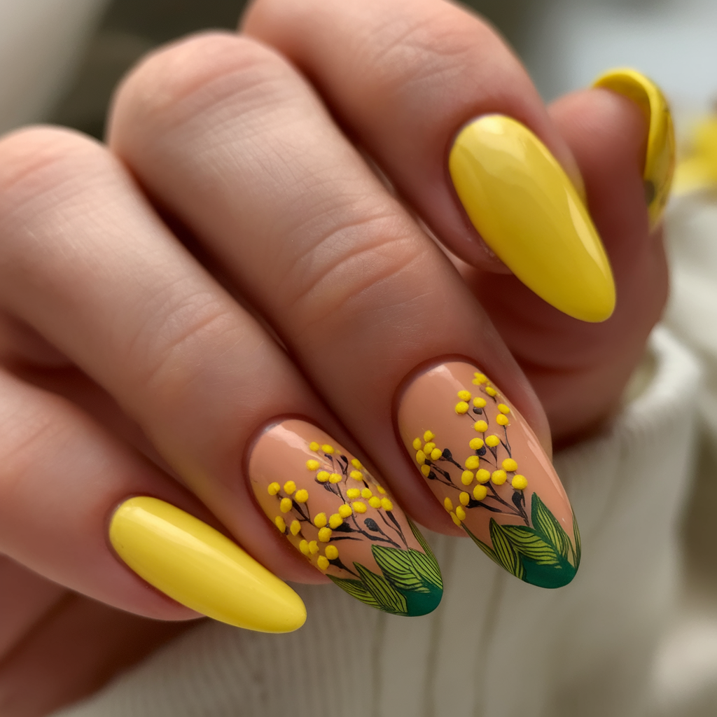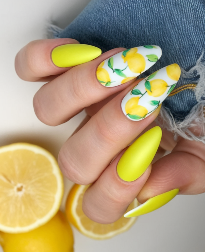 This trendy almond manicure brings a fresh twist to yellow spring nails ideas 2025 with a bold lemon print accent. The hand-painted lemons pop against a crisp white background, complemented by solid neon yellow nails with a soft matte finish. The contrast of green and yellow adds a playful, citrusy vibe that works beautifully for Easter, a birthday, or a fun spring short look. Pairing it with toes matching in the same vibrant shade completes the set.