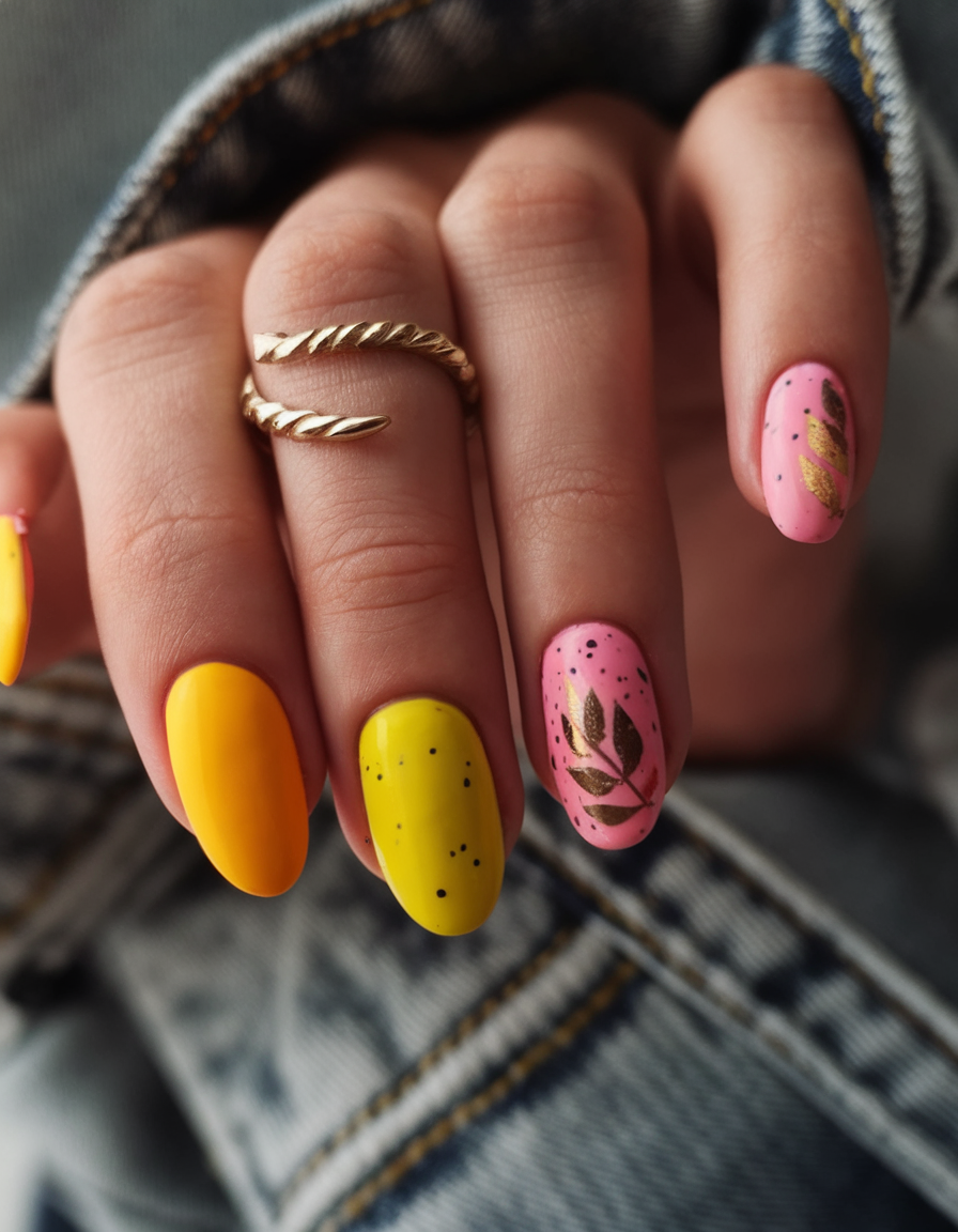 #16 Speckled Yellow and Pink Nails with Gold Accents