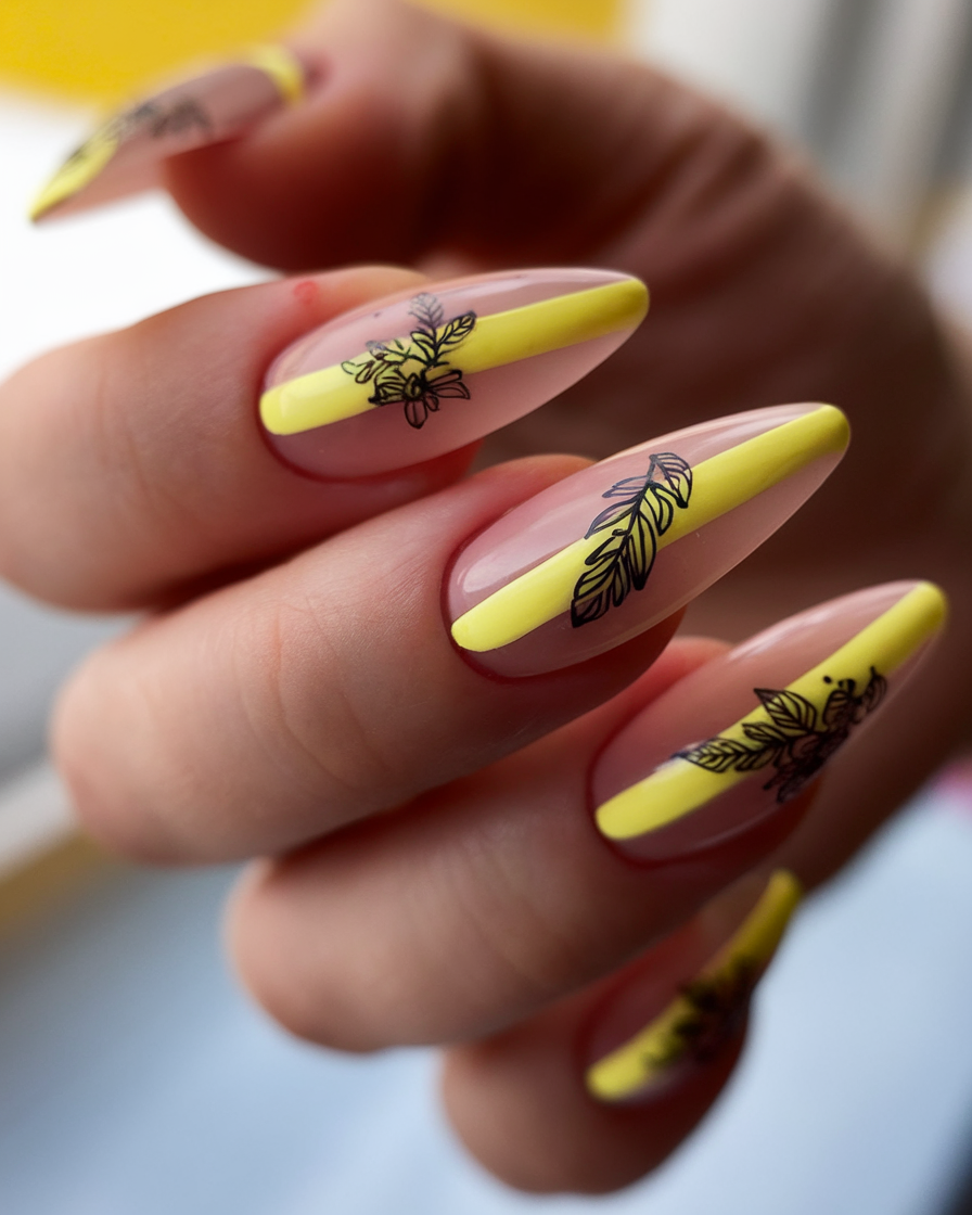 This almond-shaped manicure brings a modern and sophisticated twist to yellow spring nails ideas 2025 with a sheer nude base and sleek bright yellow stripes. The fine black botanical illustrations add a subtle, nature-inspired design, making this a perfect spring gel look. The glossy finish enhances the simplicity of the artwork while keeping the nails looking polished and fresh. This elegant 2025 manicure pairs effortlessly with a neutral-toned dress for a chic, minimalist statement.