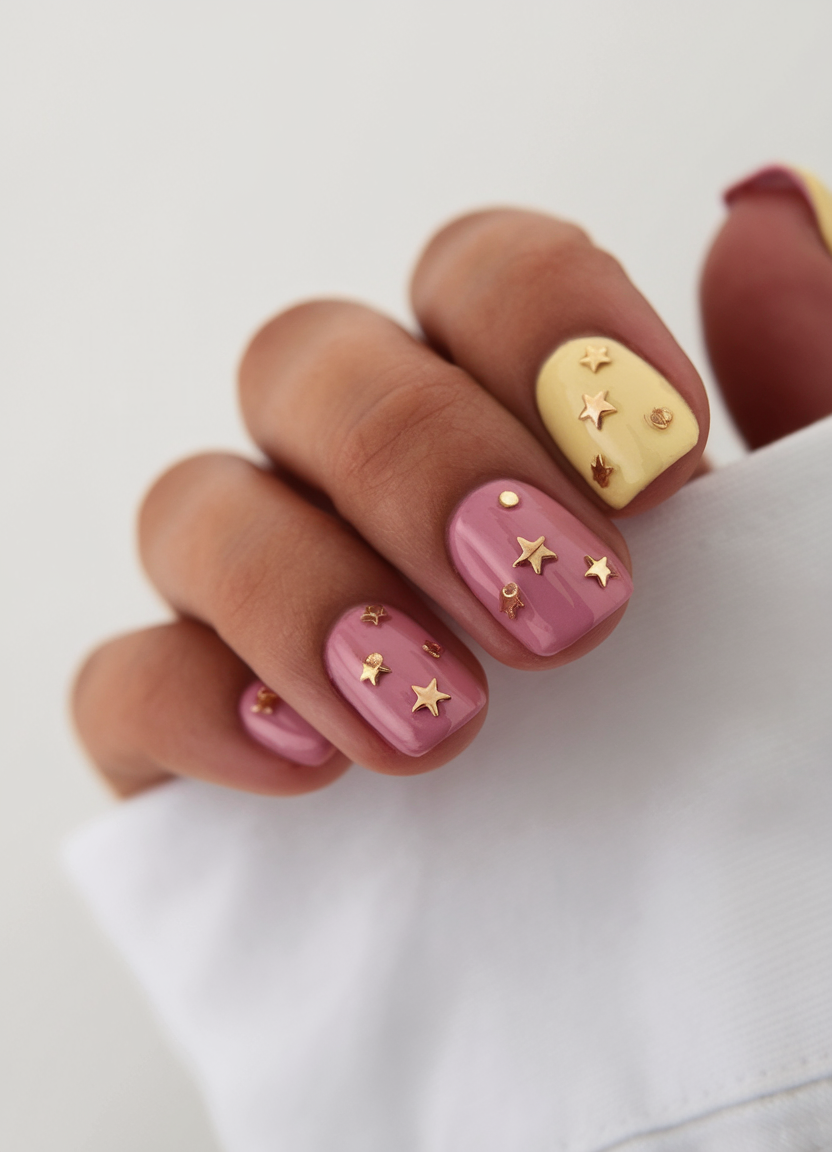 This spring short manicure combines soft pink and pastel yellow with delicate gold star embellishments for a dreamy celestial look. The square shape enhances the clean aesthetic, while the glossy spring gel finish adds a sophisticated shine. The combination of colors makes it a perfect choice for a birthday, a playful yet elegant 2025 spring simple nail style. Try pairing it with toes matching in a similar pastel shade for a cohesive set.