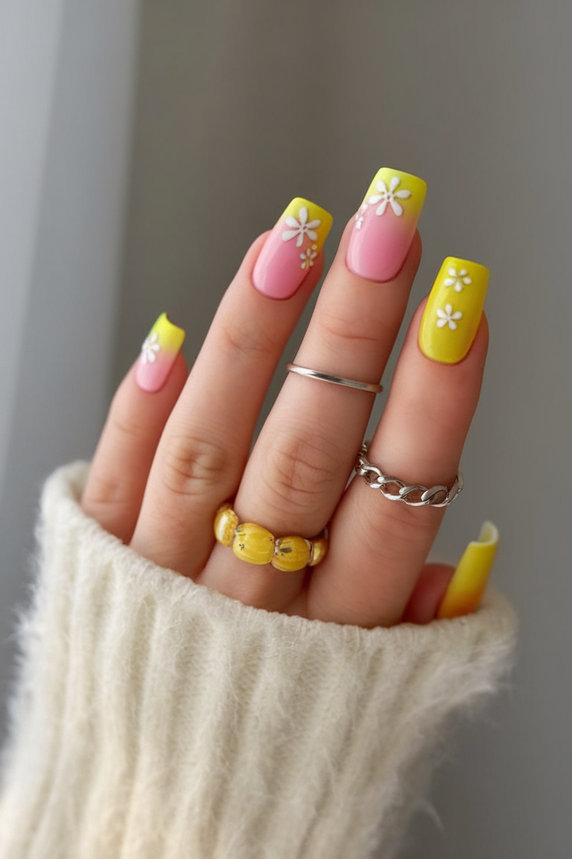 #13 Pink and Yellow Ombre Nails with Dainty Floral Accents