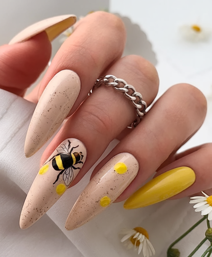 This trendy bee-inspired design features a neutral beige base with speckled details, accented by hand-painted bees and tiny yellow dots. The almond shape elongates the fingers, while the spring gel effect enhances the intricate artwork. The glossy solid yellow nails add a bright contrast, making this look ideal for a 2025 spring simple yet detailed style. A perfect choice for nature lovers, this manicure pairs well with a floral dress for a fresh, stylish touch.