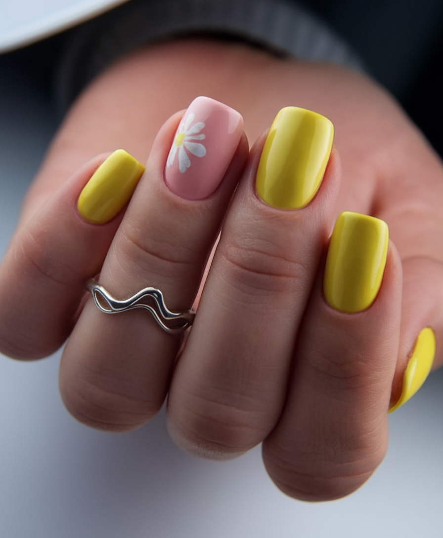 This square manicure blends simple spring elegance with a touch of floral charm. The solid yellow nails provide a classic, glossy base, while the pink accent nail features a delicate hand-painted daisy. The spring gel finish enhances the smooth look, making it a fresh and versatile choice for 2025. This design pairs well with a light dress and is perfect for a cheerful Easter or birthday look.