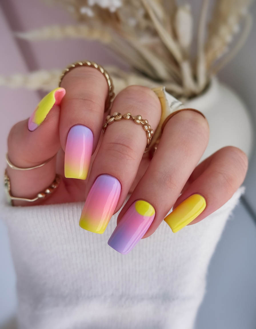 #8 Gradient Pastel Ombre Nails with a Pop of Yellow