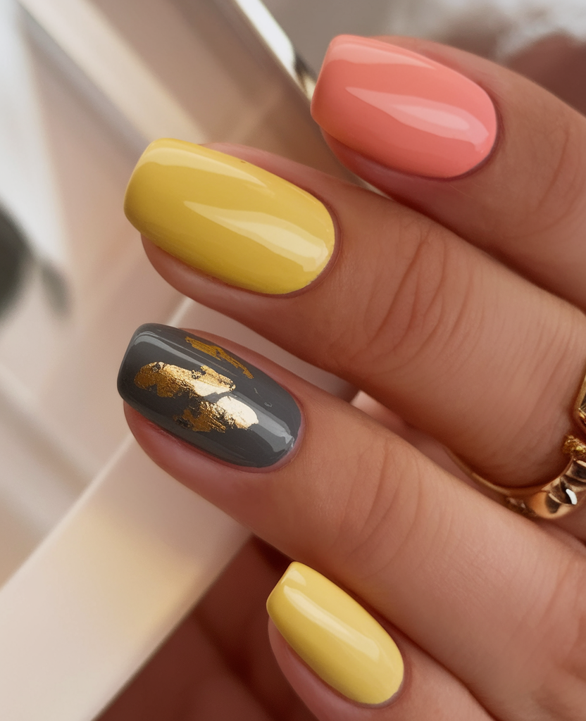 #7 Yellow, Gray, and Coral Nails with Gold Foil Accents