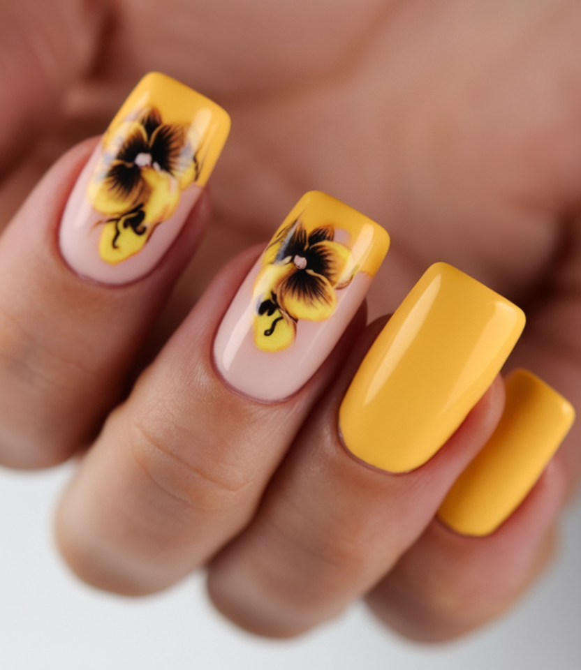 A fresh and lively take on floral designs, this set pairs soft pink-toned nude nails with intricate yellow and black pansy artwork. The hand-painted flowers create a delicate yet bold contrast against the glossy background. Solid yellow accent nails enhance the bright springtime aesthetic, balancing the intricate floral details with a pop of color.