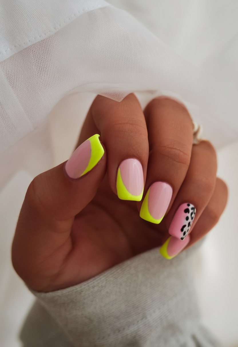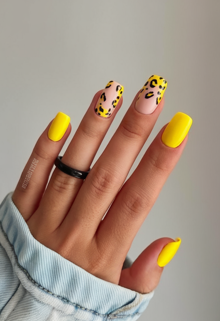 For those who love an edgy twist, this nail set combines neon yellow with a wild leopard print. The design features nude pink nails with black and yellow animal print patterns, seamlessly blending elegance with a bold, fierce touch. Glossy neon yellow polish on alternate nails enhances the vibrant energy, making this look both eye-catching and trendy.