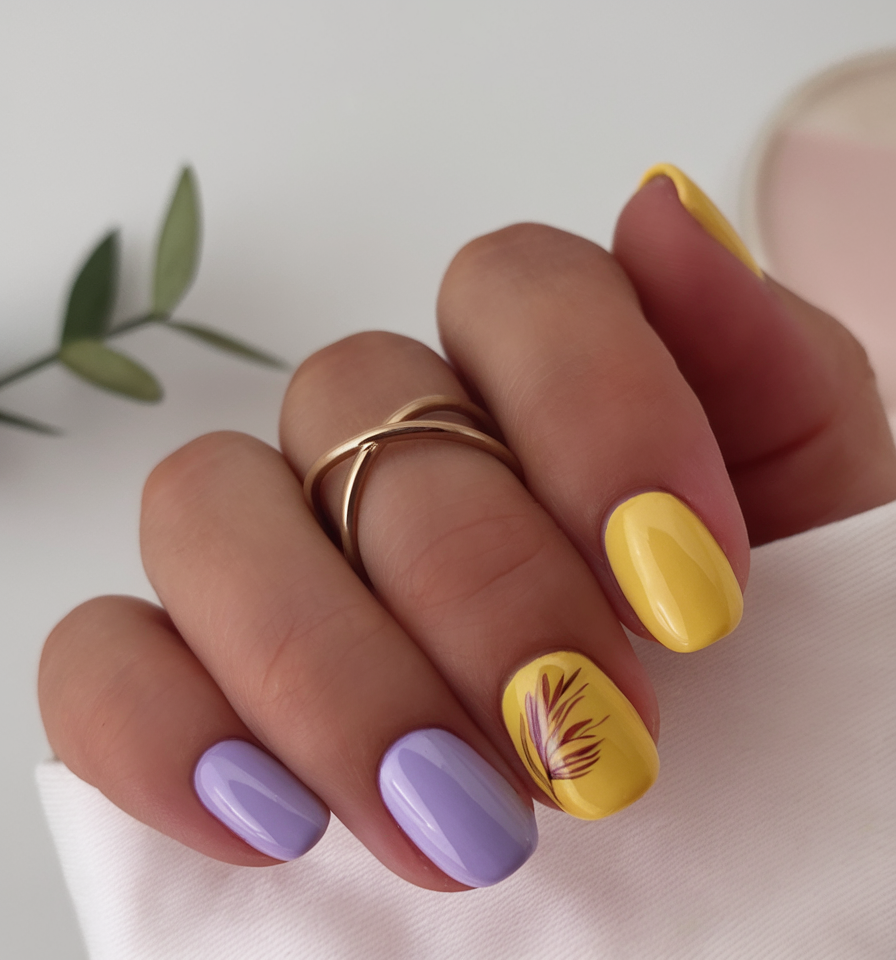 A soft, dreamy combination of pastel lilac and sunny yellow creates a delicate yet stylish manicure. One accent nail features a fine, hand-drawn botanical leaf in muted brown tones, adding a nature-inspired detail. The glossy finish enhances the pastel hues, making this a perfect choice for those who love subtle yet artistic nail designs.