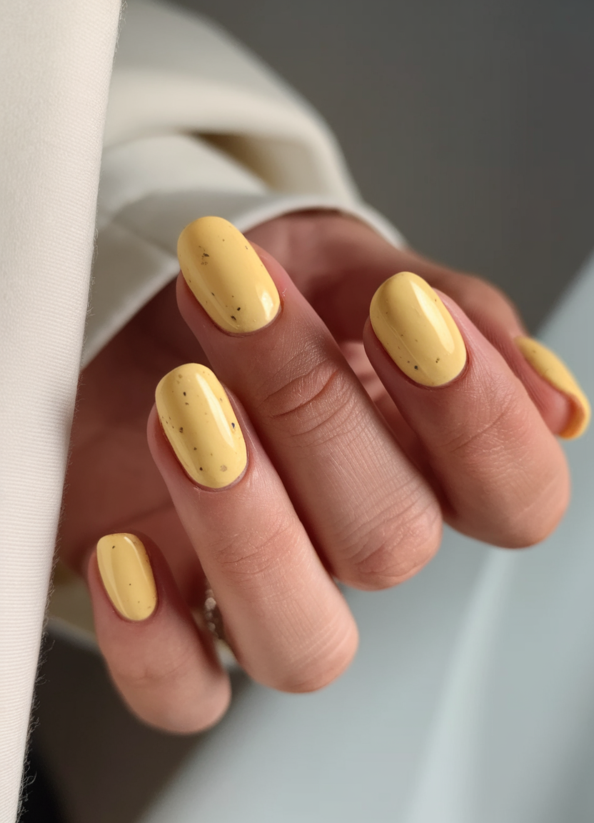 For a more subtle yet unique approach, this speckled yellow design embraces a matte pastel yellow base with fine black speckles for texture. The short, oval nail shape keeps the look natural and easy to maintain, while the tiny flecks add a modern twist to a solid color manicure. The effect mimics quail eggshell patterns, giving a soft yet artistic vibe perfect for everyday wear.