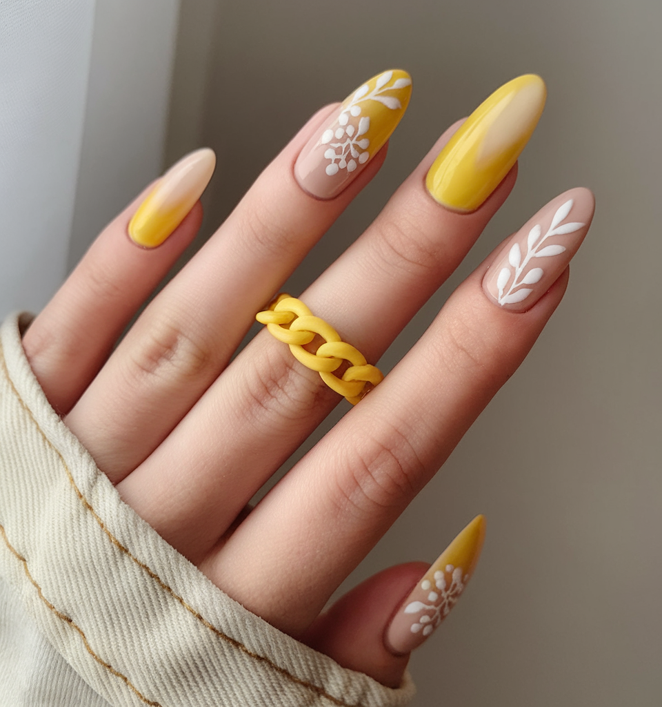 For lovers of simple but stylish nails, this spring gel manicure blends soft nude tones with bright yellow accents. The delicate white botanical details add a trendy yet effortless touch, while the almond shape keeps the overall look refined. This is a perfect choice for a 2025 manicure that transitions seamlessly from casual wear to a prom or birthday event. Pair it with a coordinating French tip on your feet for a complete toes matching aesthetic.