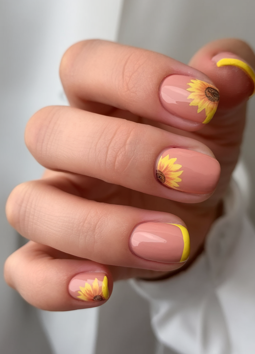 This spring short manicure features a soft pink nude base with hand-painted sunflowers, giving a delicate yet playful vibe. The French tip twist in bright yellow adds a modern touch, while the design remains minimal and stylish. This look is perfect for a birthday celebration or a casual Easter outfit, adding a floral charm without overpowering. For a coordinated look, try toes matching with a similar sunflower theme.
