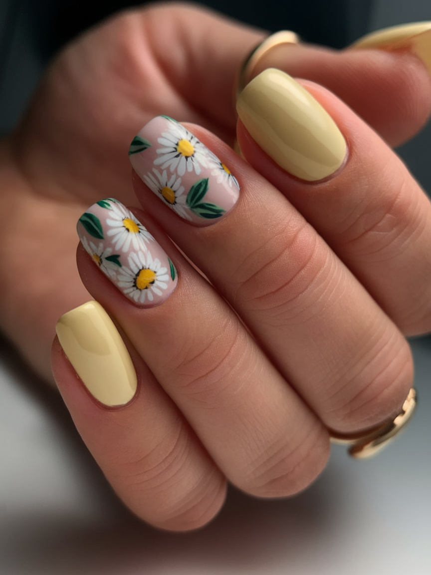 A delicate and fresh take on yellow spring nails ideas 2025, this manicure pairs creamy pastel yellow with intricate daisy designs. The green and white floral detailing adds a soft, natural look, while the square shape keeps it modern and versatile. This simple spring manicure works perfectly for an Easter brunch or a light, everyday 2025 spring simple style. Try it with a soft-toned dress to enhance the elegant vibe.