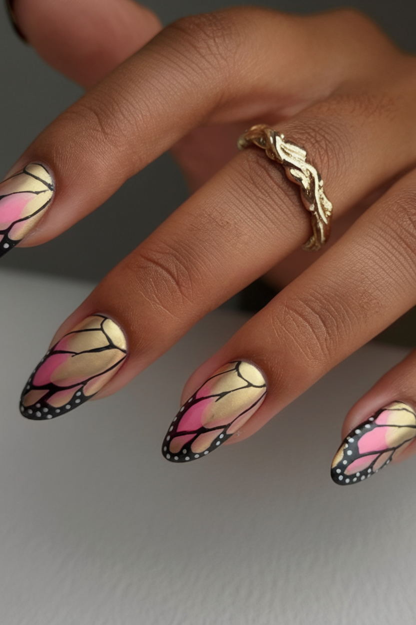 This trendy manicure takes inspiration from delicate butterfly wings, blending yellow and pink into a soft gradient. The fine black outlines mimic the intricate details of butterfly patterns, adding depth to the design. The almond shape enhances the natural elegance, while the dotted edges provide a whimsical touch. Perfect for a bold 2025 look, this nail art pairs beautifully with a flowy dress or a prom outfit.