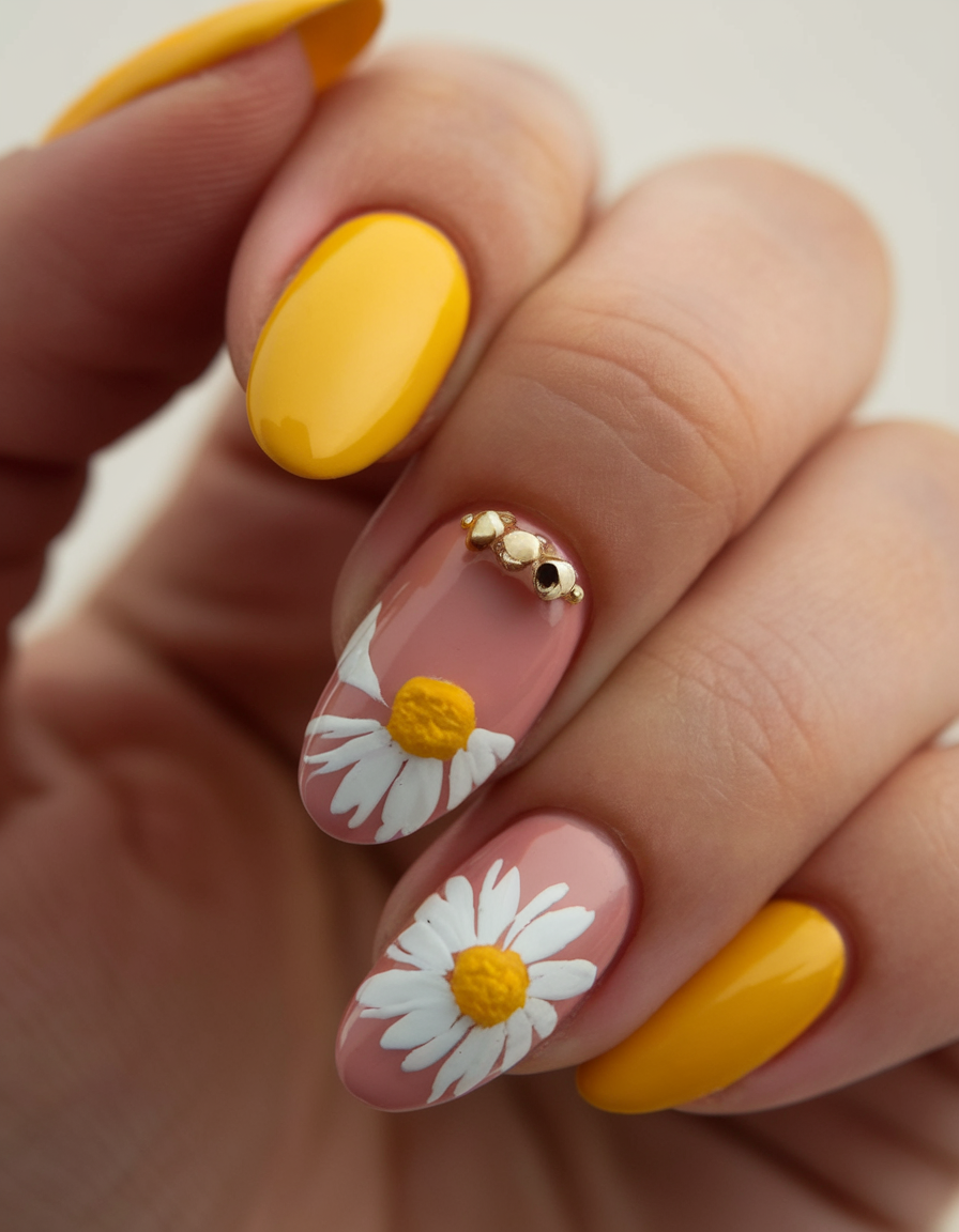 A fresh take on yellow spring nails ideas 2025, this manicure combines a bright yellow solid polish with delicate hand-painted daisies. The spring gel effect gives the petals a slightly raised texture, making the flowers look realistic. Small gold embellishments add a refined detail to the design, making this an ideal choice for Easter, a birthday, or a simple spring refresh. Pair it with toes matching in the same daisy style for a complete look.