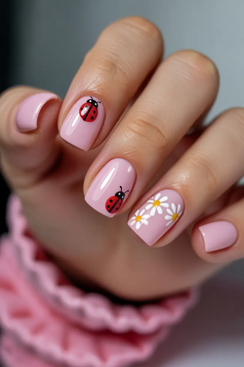 And then there are days when spring simply calls for something joyful. This short pink manicure with tiny daisies and playful ladybug accents captures that cheerful energy perfectly. It’s cute, fun, and surprisingly wearable because the soft pink base keeps everything balanced.