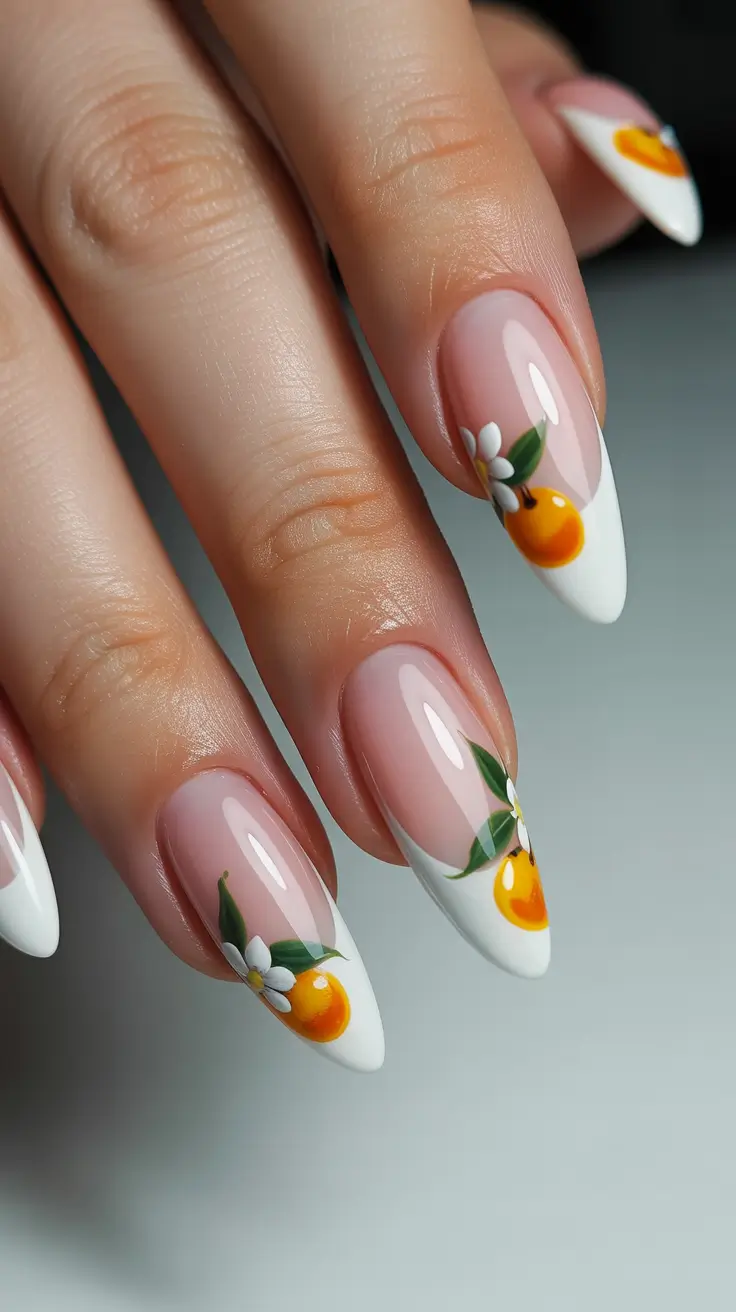 Unexpected details always make spring manicures more interesting, and tiny citrus accents bring playful freshness to classic French tips. The clean almond shape paired with white tips keeps the look polished, while miniature fruit art adds a cheerful twist that feels modern and fun.