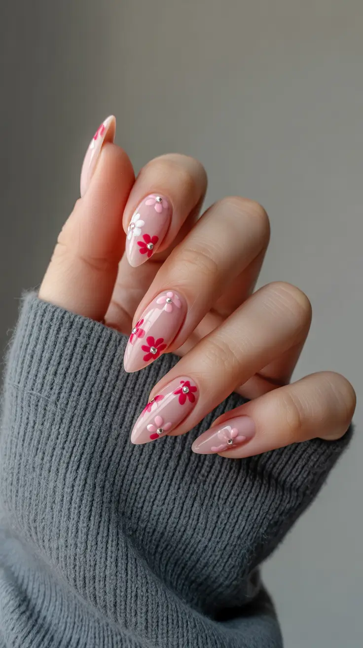 Sometimes spring style calls for something slightly more polished, and these soft pink nails with tiny floral accents and crystals deliver that balance beautifully. The glossy nude-pink base keeps the design classy, while small dimensional details add just enough sparkle without feeling formal.
