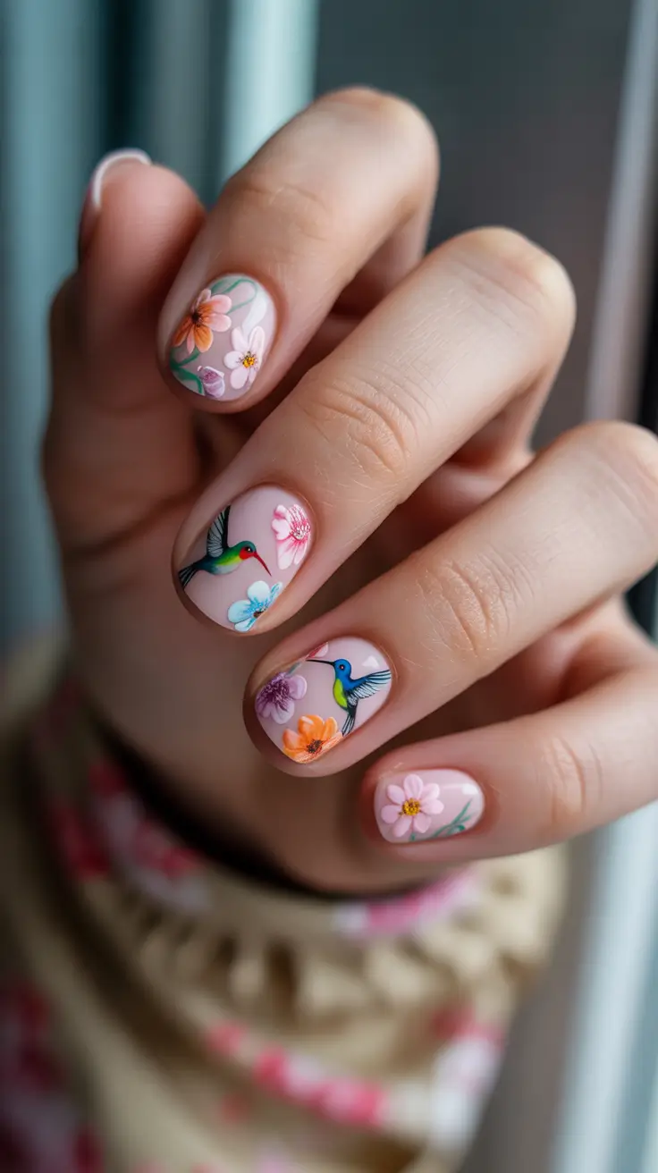 Short natural nails suddenly become storytelling pieces with tiny flowers and miniature hummingbird accents layered over a soft pink base. I love how this design proves that beginner-friendly nail art can still feel intricate. The shorter length makes it practical for everyday life, while delicate illustrations bring personality without overwhelming the manicure – perfect Easter or cute spring inspo.