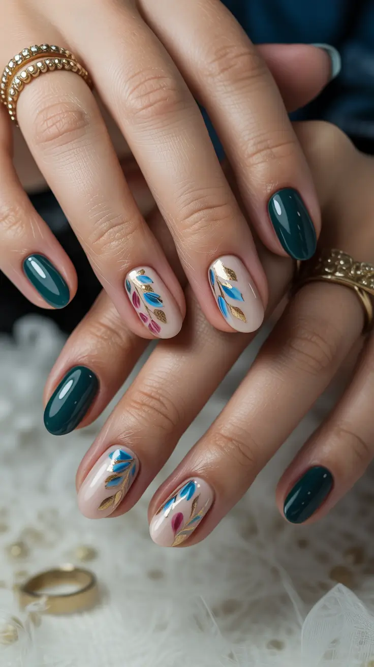 Deep green polish paired with minimalist botanical accents instantly shifts spring nails into a more mature, fashion-forward direction. I love this combination because it proves bright colors aren’t required to feel seasonal. The glossy emerald tone adds depth, while soft neutral accent nails decorated with blue and gold leaves keep the manicure light and artistic.